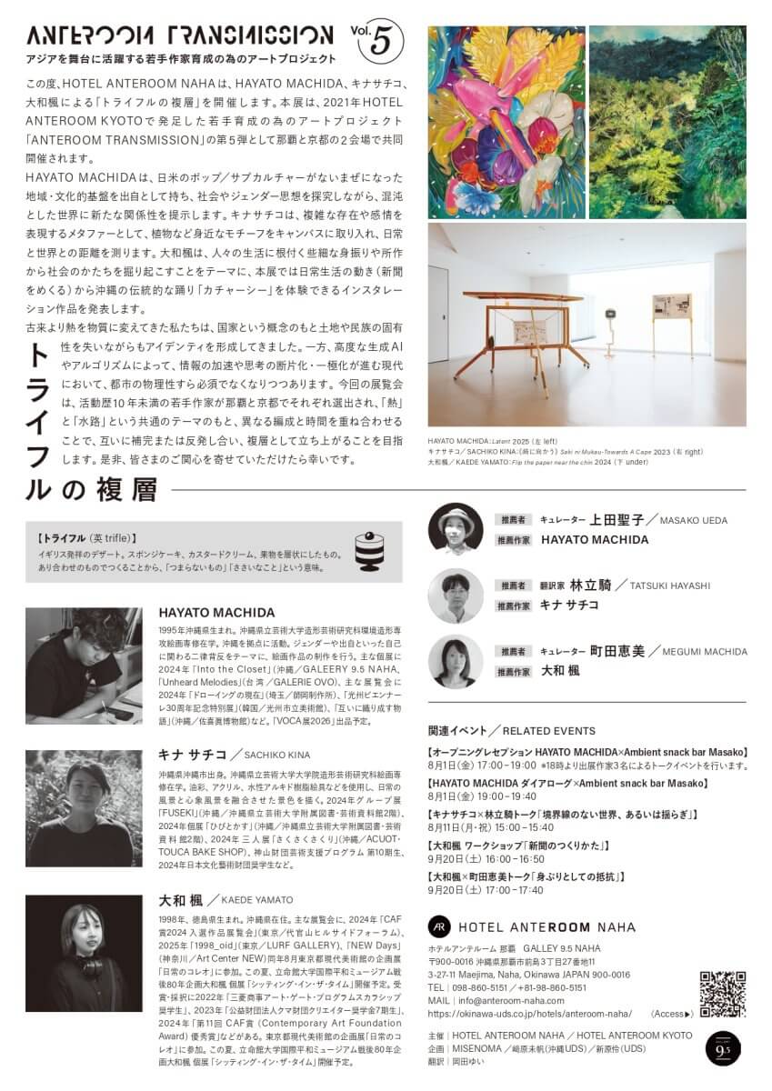ANTEROOM TRANSMISSION初の沖縄開催となる本展では、プロジェクト企画者の上田 聖子、翻訳者の林 立騎、キュレーターの町田 恵美の3人の推薦者に、沖縄県内で活動する活動歴5年以内もしくは在学中の作家を推薦いただきました。HAYATO MACHIDAとキナ サチコ、大和 楓の3人の作家による身近なことから沖縄や社会の歴史・多様性をそれぞれの視点で境界線をすくいとった作品をご覧にどうぞ会場まで足をお運びください。